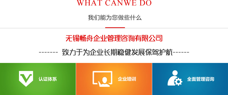 無錫暢舟企業管理咨詢有限公司是一家專業從事企業管理咨詢,技術咨詢,品質管理等咨詢以及相關認證咨詢服務和培訓的企業,公司主要業務包括:企業管理咨詢;企業運營模式咨詢;6S管理;精益生產;現場管理;ISO9001質量管理體系認證咨詢;ISO14001環境管理體系認證咨詢;ISO45001職業健康安全管理體系認證咨詢;ISO20000 IT服務管理體系認證咨詢;ISO27001信息安全管理體系認證咨詢;3C認證咨詢;3A認證咨詢;服務認證咨詢;IATF16949汽車行業質量管理體系認證咨詢;軟件能力成熟度模型CMMI 3級到5級等認證咨詢;